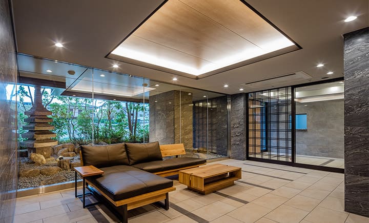 - ・元々あった日本庭園の灯篭の一部を移設した石庭を配置し、土地の記憶を継承。