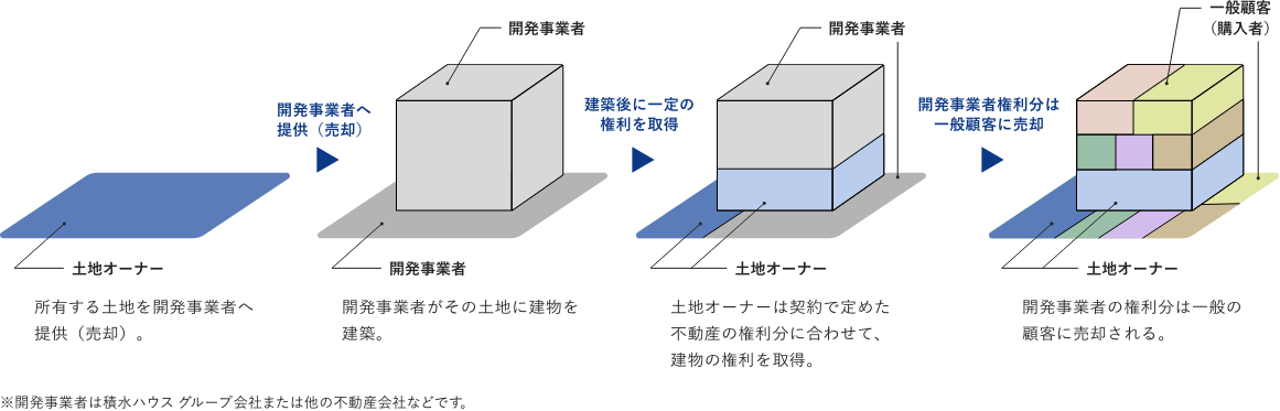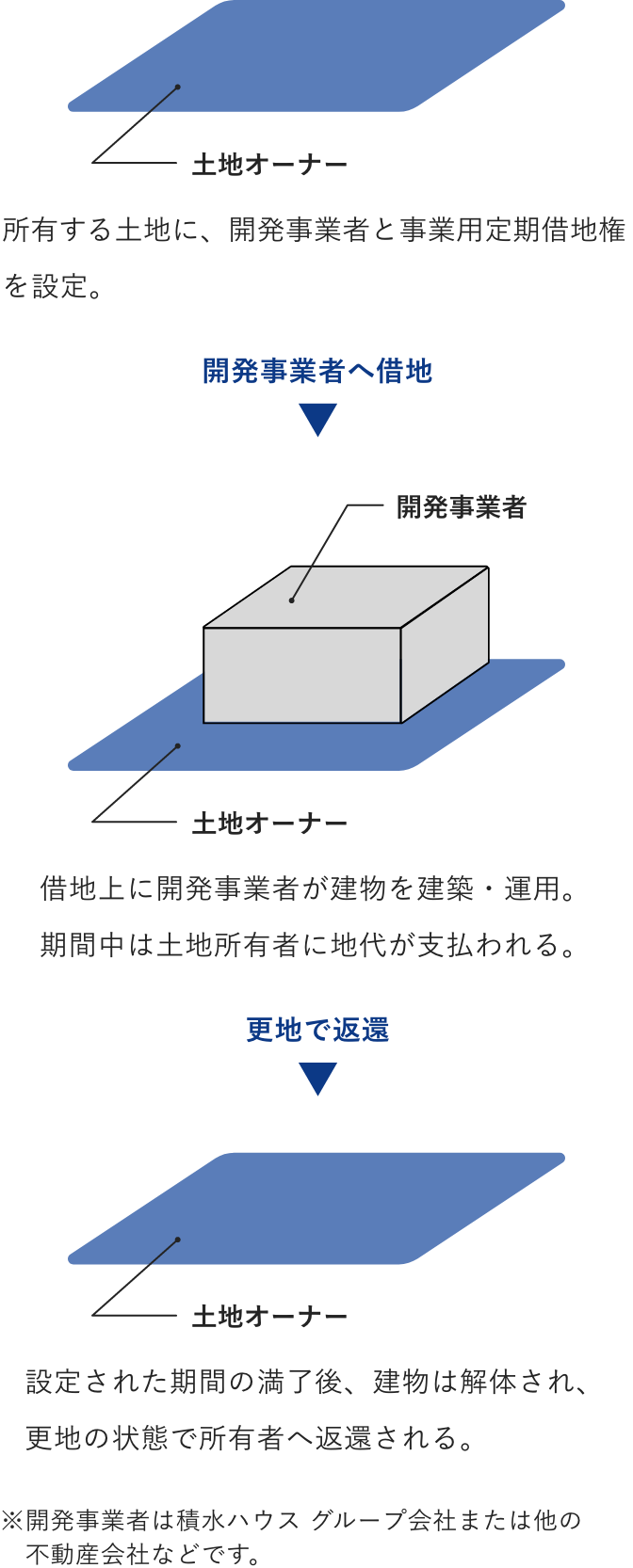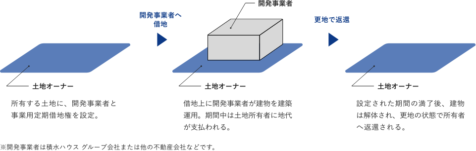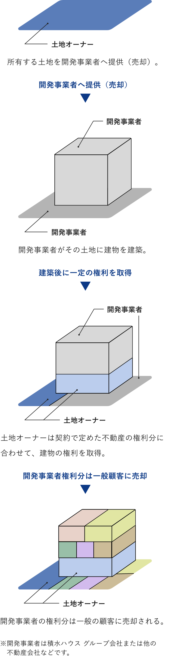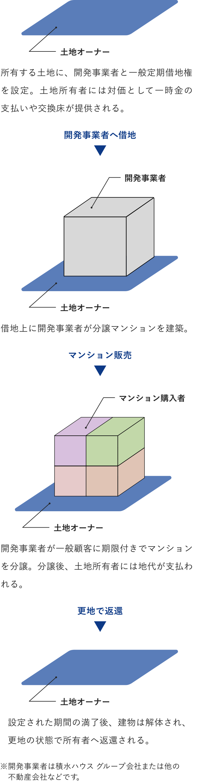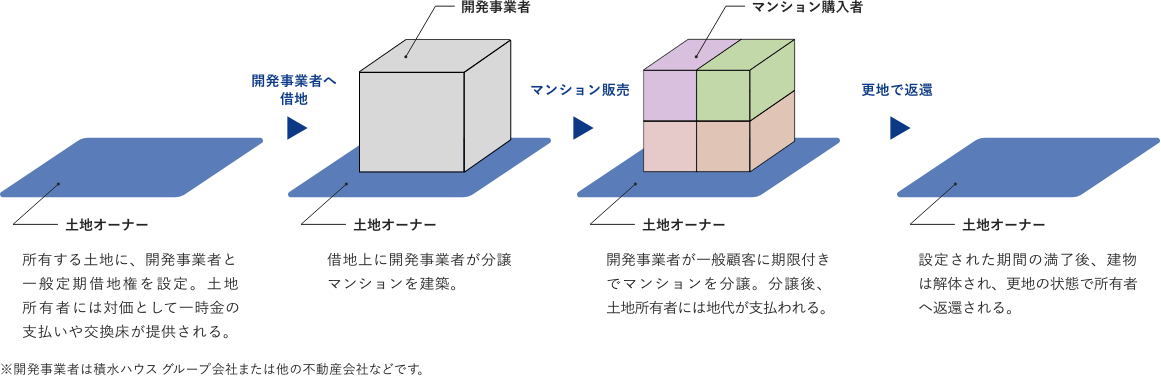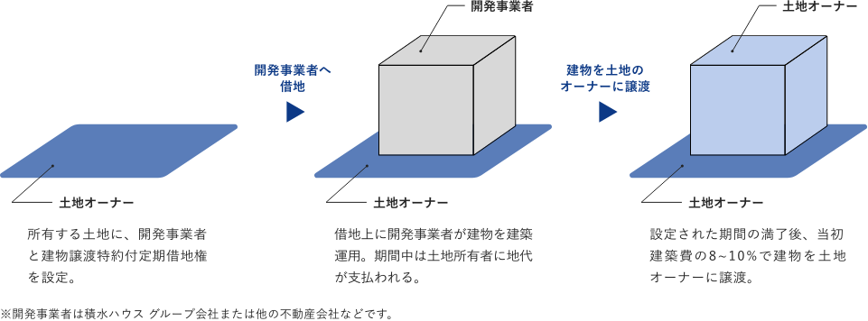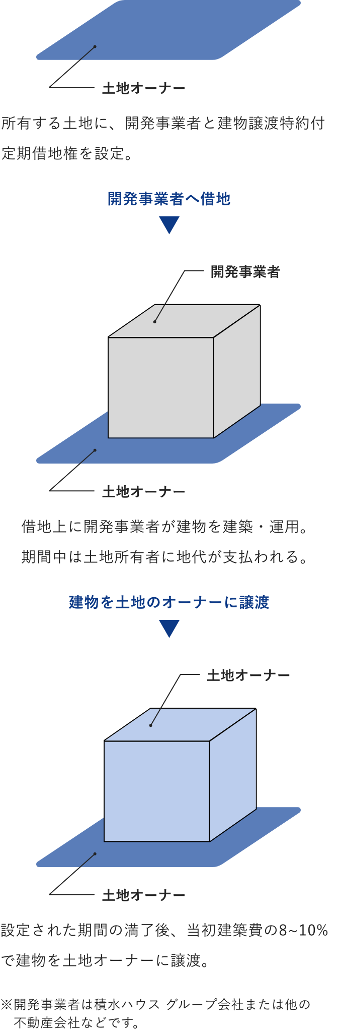 たとえば、積水ハウス不動産が土地をお借りして建物の建築・管理運営までを担い、地代を土地のオーナー様にお支払いするスキームをはじめ、信頼できる開発事業者とのマッチングや資産承継のサポートまで、積水ハウスならではのご提案を行っています。