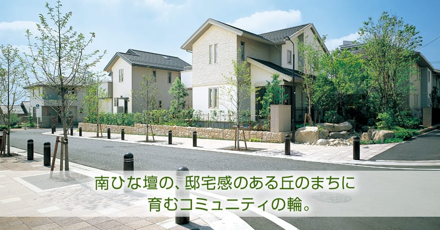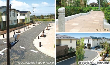 分譲地のエントランスから緩やかにカーブを描く道路をすすむと、緑豊かで邸宅感を感じさせるゆったりしたまちなみがあらわれます。
