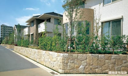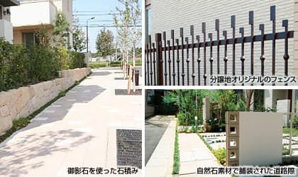 石積みにはグレード感のある錆色がかった御影色を使い、植栽の緑との調和を図っています。また、まちの周縁の一部を囲むフェンスはコモンステージおゆみ野だけのオリジナルデザイン。まちなみ全体の調和を考えたまちづくりには、こんなさりげないヒミツがあります。