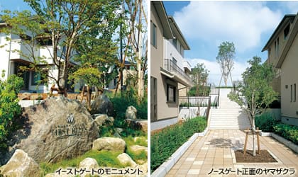 タウン内への玄関となる2カ所の主要な入口「ノースゲート」と「イーストゲート」には、季節をテーマにした自然石のモニュメントがあり、住民達をお出迎え。また、ノースゲートの正面には高さ10mものヤマザクラがまちのシンボルツリーとして、みんなの心を和ませてくれます。