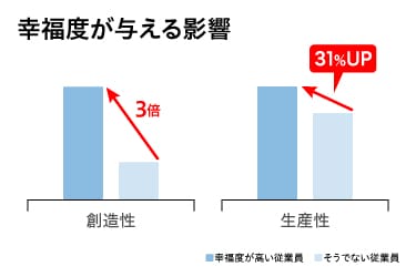 従業員の「満足度」とは、福利厚生や職場環境などの満足度を測る指標。一方、従業員の「幸福度」とは、働きがいや自己成長など主観的で、仕事とプライベートを含む人生全体の指標です。米国の心理学者による研究によれば、幸福度が高い従業員は、そうでない者より創造性が3倍高く、生産性は31%高いといいます。従業員が幸せに働くことで、高いパフォーマンスを発揮し、コミュニケーションが活性化してイノベーショ ンが生まれやすくなるのです。