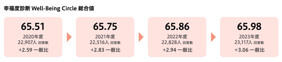 “「わが家」を世界一幸せな場所にする”というビジョンの実現には、まずは従業員の幸せを追求することが大切です。そこで2020年11月、積水ハウスグループ全従業員の約27,000名を対象に、「幸せ度調査」を実施しました。幸福経営学の第一人者である前野隆司教授*の監修により、従業員と職場の幸せを多面的に計測し、相関を分析する調査は日本で初めての取り組み。2020年からの4回の調査結果において、当社従業員の「幸福度診断Well-Being Circle」総合値は、一般平均より毎年高く、4年連続増加の傾向にあります。
