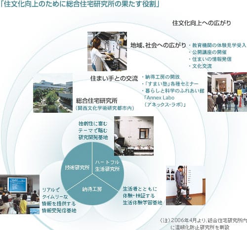 家は「買う」ものでなく「つくる」もの。生涯に何度もない大きな買い物を、お客様にじっくり納得していただき、家族の暮らしを一緒にデザインしつくっていきたい― そんな思いから1990年に設立した総合住宅研究所は、技術研究所、ハートフル生活研究所の2つの研究所と納得工房からなります。納得工房は、お客様と従業員が一緒に、体験し、検証し、納得してから住まいづくりを始めるための出発点。家は洋服や靴のように、試着できないものです。完成し入居してから「こんなはずでは…」という思いをお客様に抱いてもらわないためにも、体験と納得をコンセプトに開設しました。体験された住まい手の暮らし方に関する生の声は、研究者にフィードバックされ、研究・開発に役立てています。