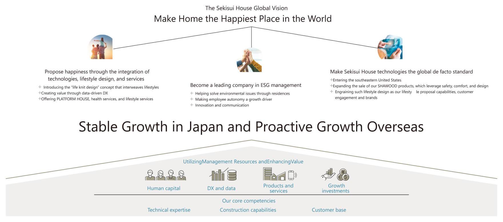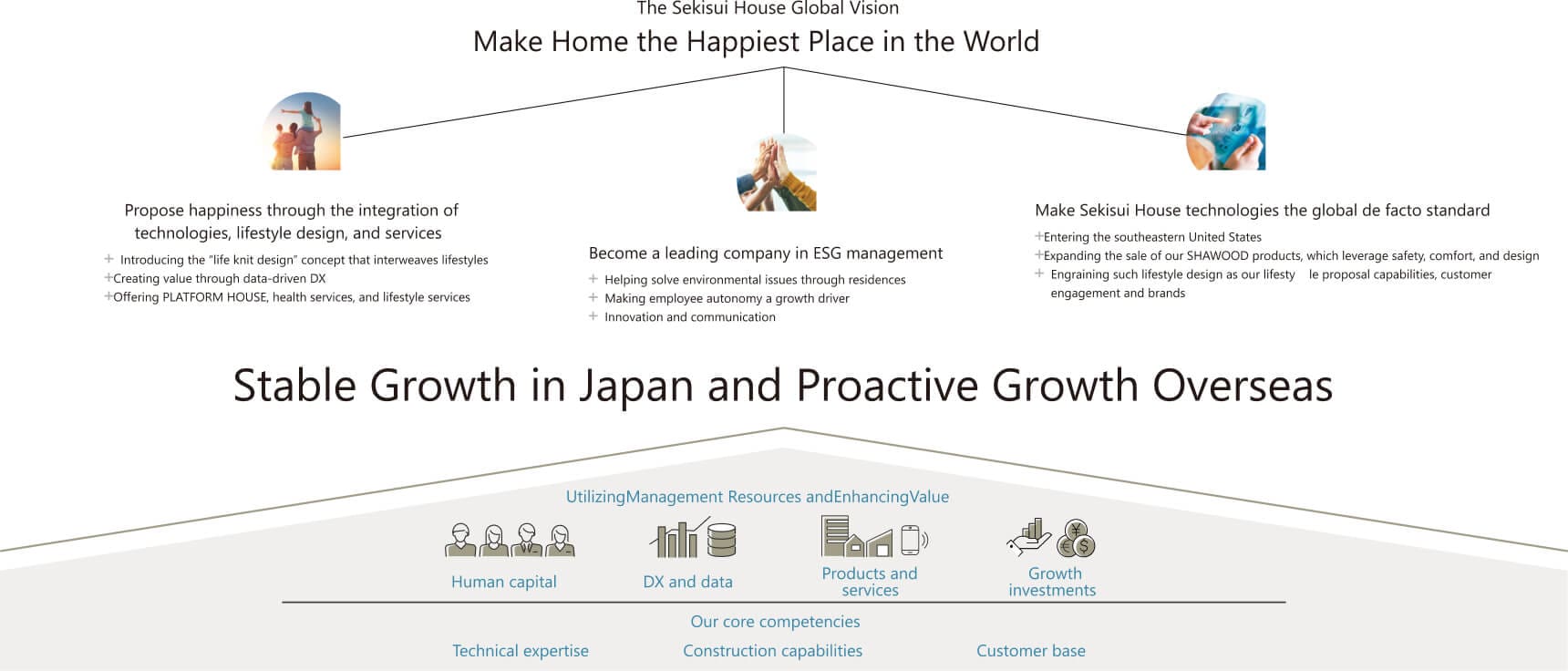 Guided by our global vision—“Make Home the Happiest Place in the World”—we aim to evolve into a global company that provides integrated technologies, lifestyle design and services, all rooted in housing and built upon the core competencies we have cultivated since our founding.