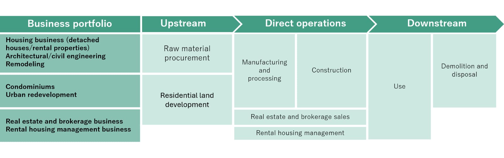 We evaluated the impacts and dependencies of all direct operations within our Group's business portfolio and conducted an analysis of associated risks and opportunities. In addition, after taking into account the scale of our operations and their financial significance, we performed an upstream evaluation of impacts and dependencies, along with a risk and opportunity analysis in our housing business. We also conducted a detailed analysis of impacts and dependencies on nature in wood procurement, which represents significant impacts and dependencies in the upstream value chain.