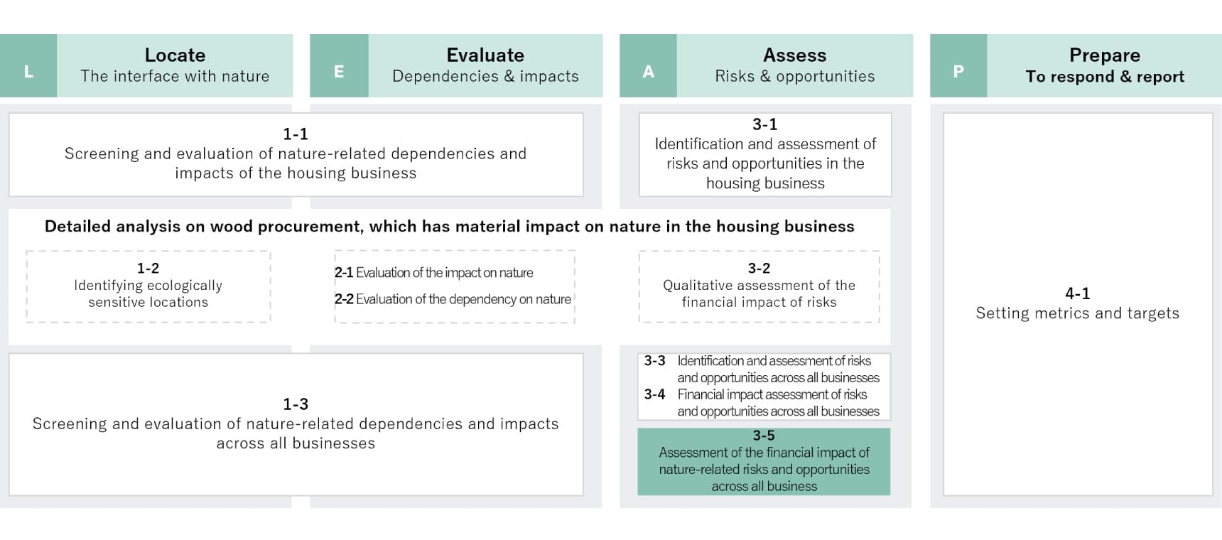Accordingly, the Company considers risks and opportunities related to nature as well as assesses its impact and dependency based on the LEAP approach in the TNFD (Figure 2). In Value Report 2024, we screened and evaluated nature-related dependencies and impacts (1‒1), organized initiatives and used scenario analysis to prioritize our responses to risks and opportunities (3‒1). We conducted an advanced analysis of wood procurement in the material procurement process, which is one of the four stages of our housing business (material procurement, manufacturing and processing, construction, and demolition) and has a high impact and dependency on nature, using big data on biodiversity possessed by Think Nature Inc.¹ Through this, the Company identified points of contact with nature that bear particular importance and evaluated impacts and dependencies (1‒2, 2‒1, 2‒2), as well as qualitatively assessed the financial impact of risks (3‒2). This report locates and evaluates nature-related impacts and dependencies across the direct operations of all businesses (1‒3). It also identifies risks and opportunities, and quantitatively assesses the financial impact on these businesses (3‒3, 3‒4). In FY2025, we discussed and reviewed our response to the risks and opportunities identified in 3‒3 (3‒5).