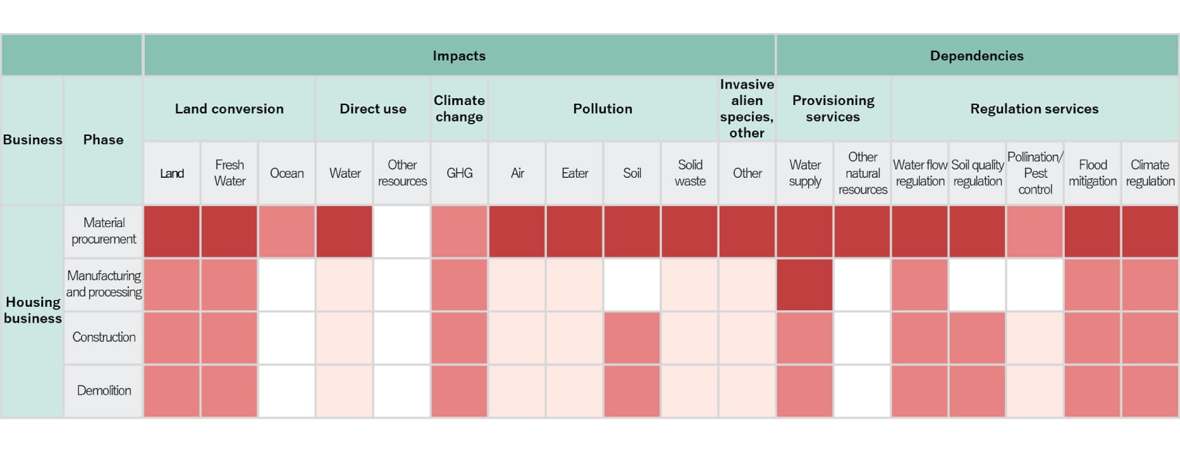 | Dependency | The degradation of ecosystems poses challenges in sourcing materials from habitats associated with threatened species and products from supply chains that have a significant impact on the environment. This may affect the overall capacity for housing supply. | Financial impact | Time horizons |