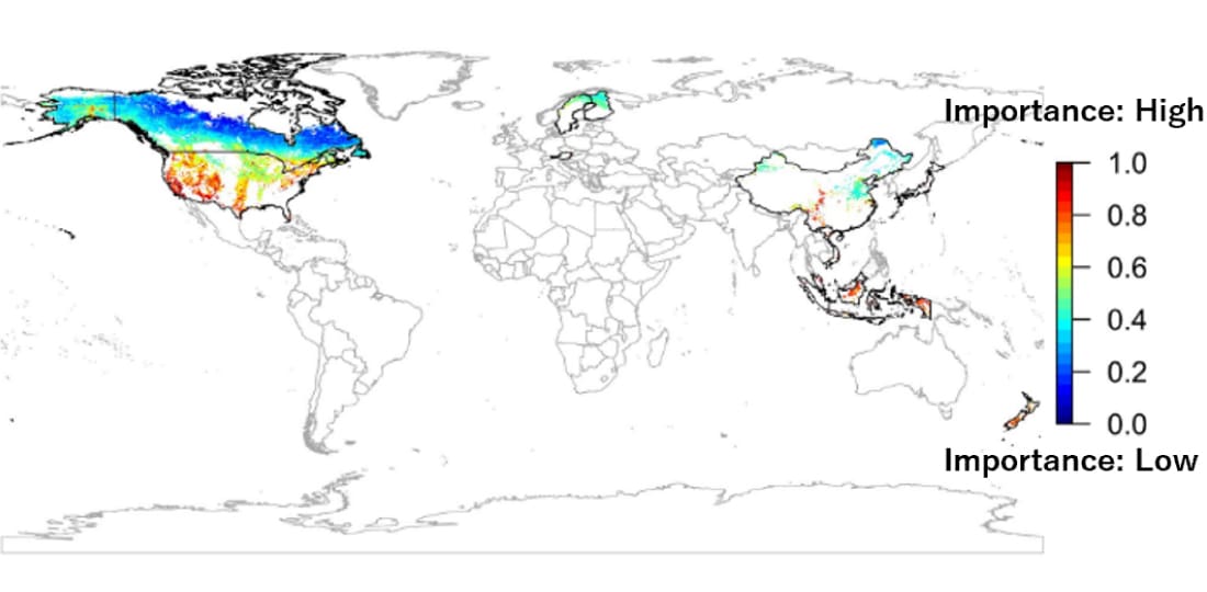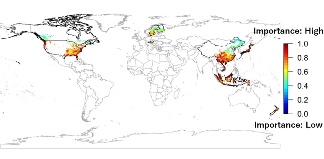 To identify areas that are deficient in ecosystem services and vulnerable to dependencies on nature, we analyzed forestry-dependent ecosystem services, as identified by ENCORE. As a result of this analysis, we found areas in the following regions to be lacking in essential functions that wood procurement activities depend on: soil stabilization and erosion control in the Chugoku and Shikoku regions of Japan, pest control functions in the central and southern parts of Sweden, as well as in all natural forests in the United States and plantation forests in its northern and western regions, and flood protection functions in the northern parts of Austria.