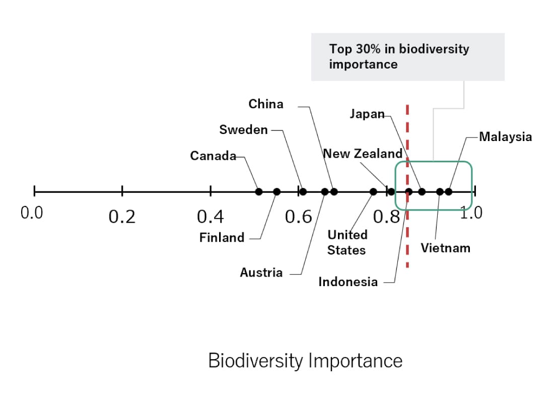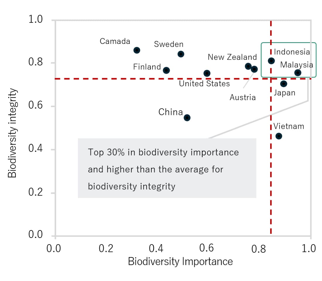 To start, we evaluated the biodiversity importance2 and the biodiversity integrity (hereafter referred to simply as “importance” and “integrity” respectively) of natural forests (Figures 4 and 5), focusing on the top 11 countries1 that accounted for 90% of our wood procurement in FY2022. In plantation forests, we only evaluated the importance (Figure 5). The distribution of the evaluation results for the 11 countries is shown in Figures 6 and 7. Our findings revealed that, out of the 11 countries evaluated, the highest conservation priority areas for natural forests are Indonesia and Malaysia, and the highest conservation priority areas for plantation forests are Indonesia, Malaysia, Japan and Vietnam. Understanding the impact in these areas is therefore of the utmost importance.