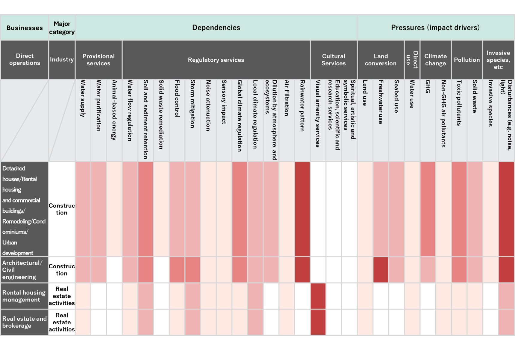 Figure 3. Potential impact drivers and dependencies on natural capital in all businesses (direct operations)