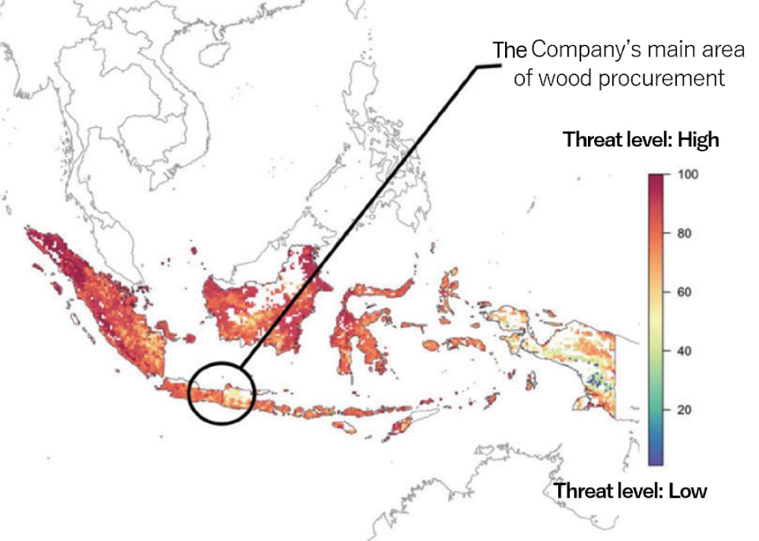 *5 Refers to land conversion of terrestrial ecosystems for purposes such as agriculture, forestry or urban development. The magnitude of terrestrial ecosystem use was assessed by multiplying geographical data on the degree of threat to the terrestrial ecosystem by the volume of procurement distribution. The degree of threat to the terrestrial ecosystem was evaluated by scoring the concentration of rare species that are threatened by land use and development activities. It is important to note that land use and development may occur for reasons beyond wood production. Consequently, there may be additional factors influencing the degree of threat to the terrestrial ecosystem in areas identified as having high levels of threat.