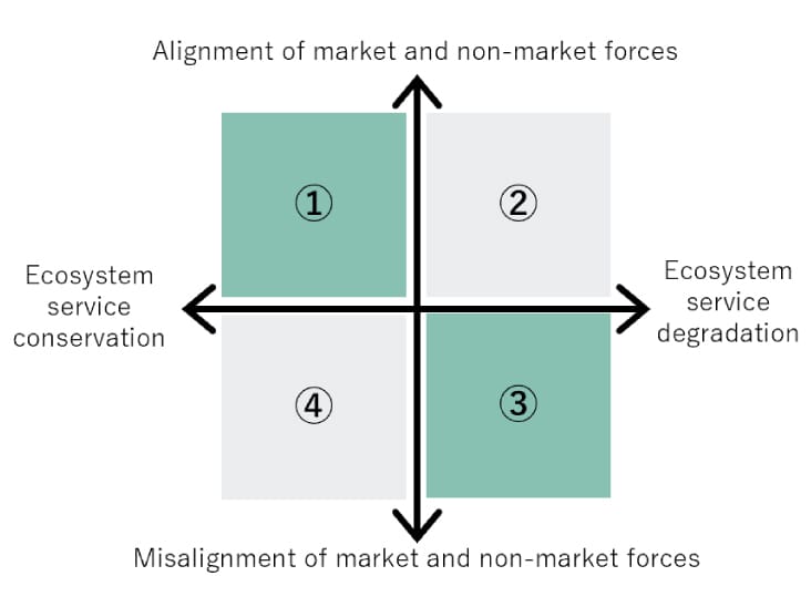 *6 In constructing the scenarios, we used WWF’s Living Planet Report 2022 and IPCC’s Sixth Assessment Report (2021) as references to set fixed conditions regarding the state of nature in 2040. In Scenario 1, with the horizontal axis representing the state of nature, the ecosystem is gradually recovering and the global environment is projected to improve due to achievement of the 1.5°C scenario. The vertical axis represents market and non-market forces moving in the same direction. This scenario envisions a world where society, laws, regulations and the economy are all moving in a way that is beneficial for the environment. Scenario 3, on the other hand, envisions a world where ecosystems degrade and climate change-induced temperature increases continue. The vertical axis shows market and non-market forces running counter to each other, with society, laws, regulations and the economy moving in a way that is detrimental or has no positive impact on the global environment.