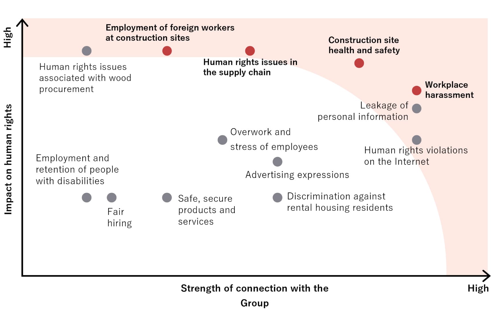 Based on our Human Rights Policy, we have incorporated human rights due diligence processes into our business activities and are promoting initiatives for top management, all Group employees, customers, supply chains and people working at partner building constructors. In this report, we seek to clarify the overall picture, progress and issues regarding our human rights initiatives and fulfill our responsibility of “Disclosure” as stipulated in our Human Rights Policy.