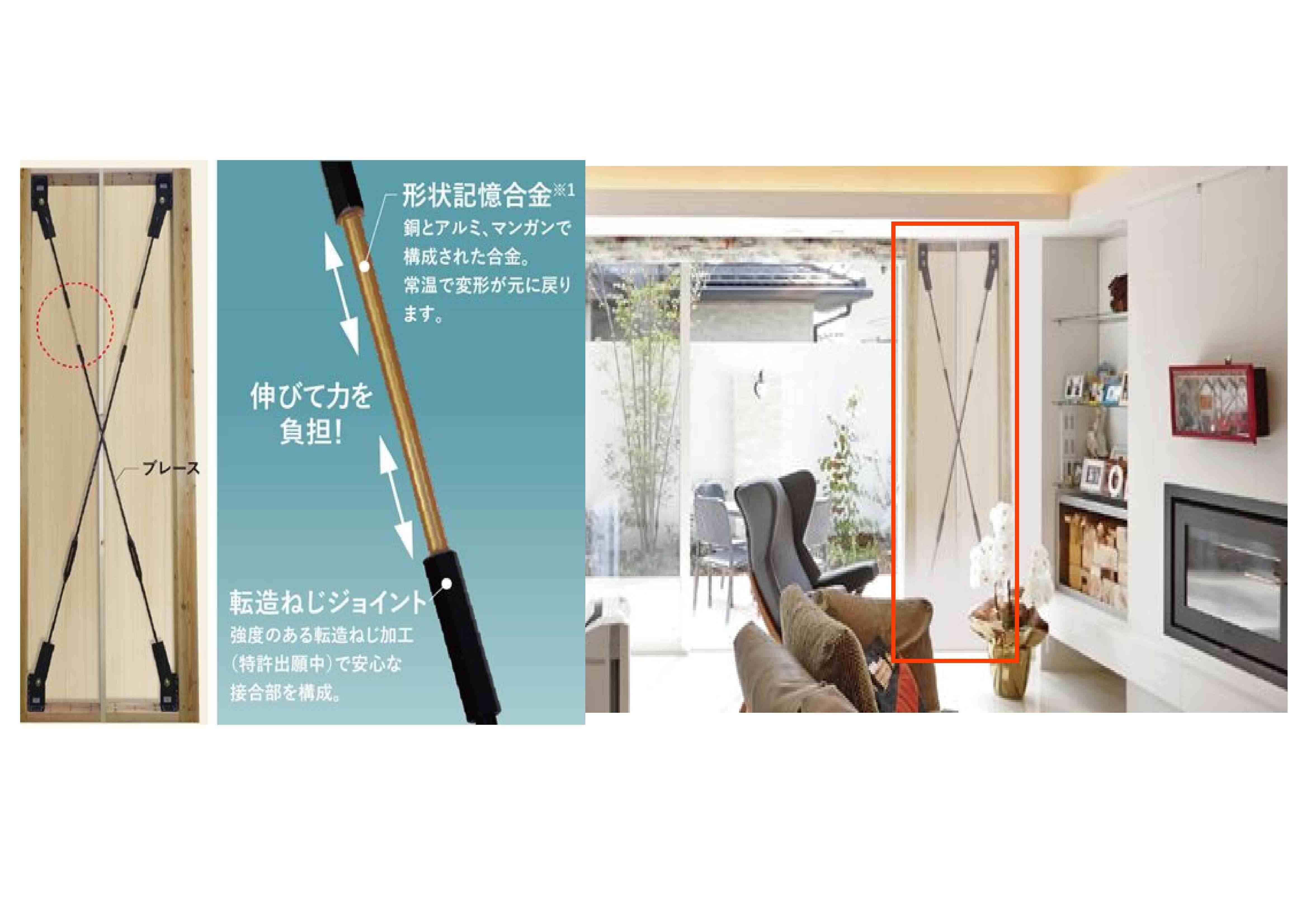 積水ハウス建設オリジナルの「形状記憶耐力壁」は、常温でも変形が元に戻る「形状記憶合金」をブレースに組み込み、高い変形能力と繰り返し性能を持つ耐力壁です。建築業界で初めて形状記憶合金を構造躯体に導入しました。