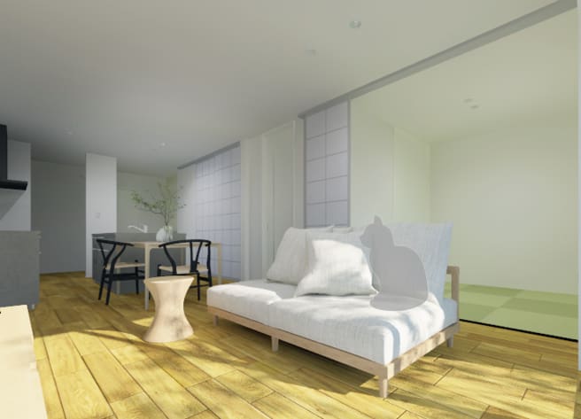 キャットウォークで猫ちゃんが遊び、和室で家族がくつろぎ、公園に向けた大きな窓からは、季節の移ろいを感じられます。