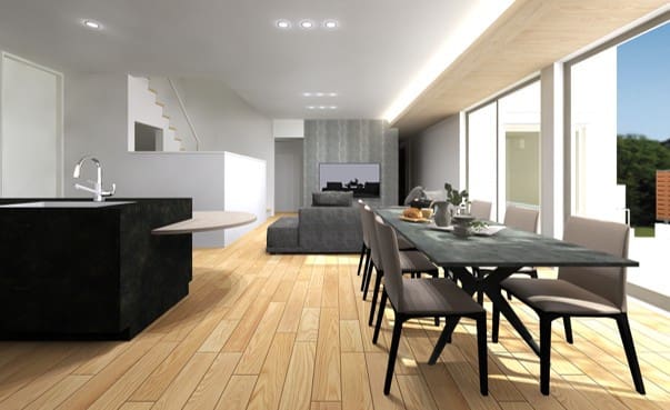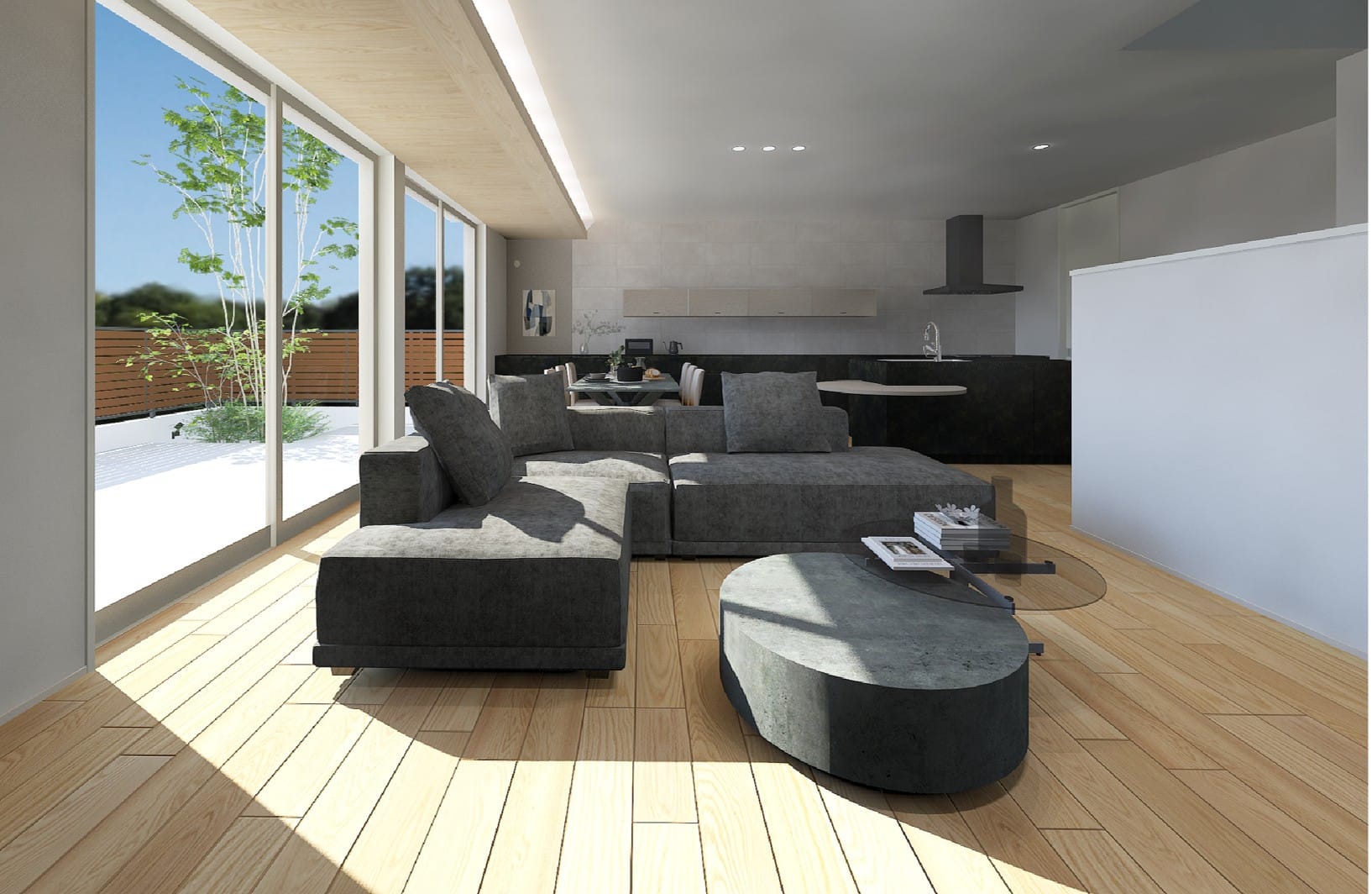 吹き抜けとつながるステージリビングと約40帖の大空間無柱で広いLDKを実現しました。