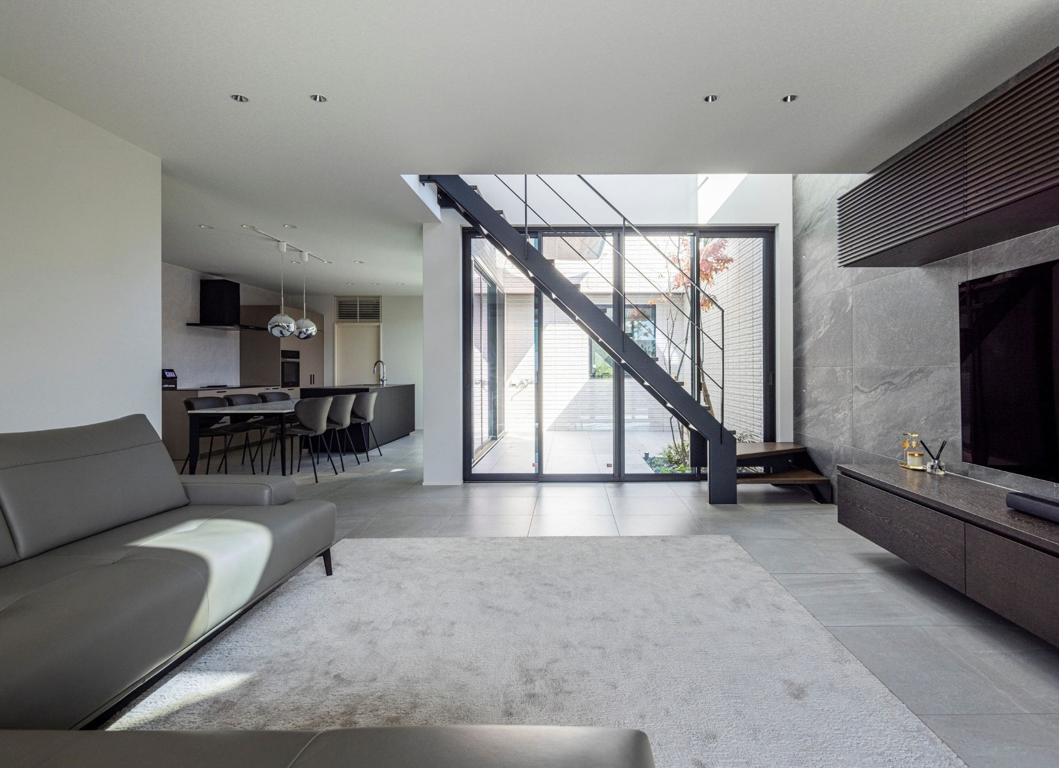 南側の庭と中庭の二つの庭に囲まれたリビングは、家族の時間を穏やかに包み込みます。