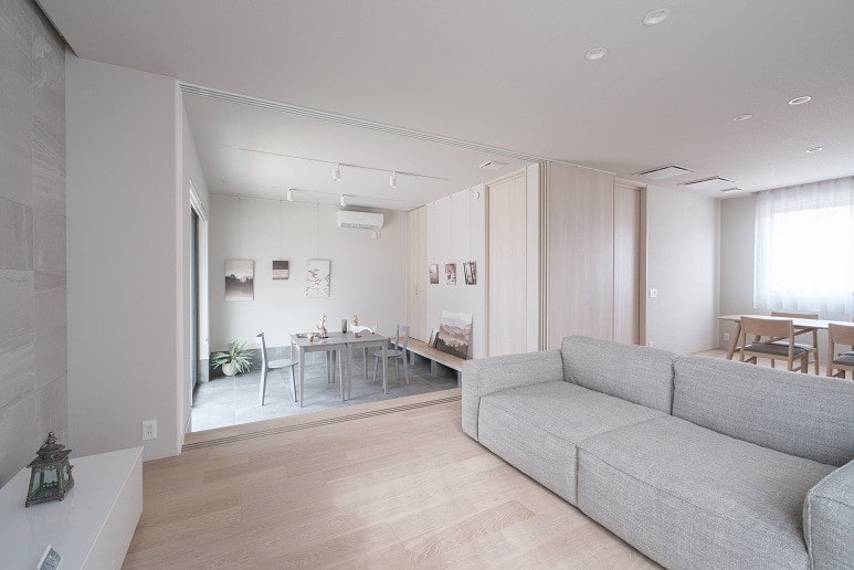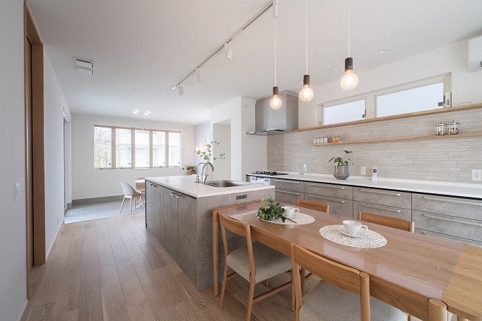 ライトグレーと白でまとめられたスタイリッシュなLDK。オープンな対面式キッチンで、ご家族との会話がはずみます。引き戸を開放し、土間スペースと一体利用も可能。/2024年2月撮影