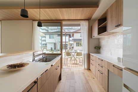 土間スペースと繋がるダイニングキッチン。窓の外に広がる景色が心地よく開放的です。食事の支度をしながら、土間で遊ぶお子様を見守ることもできます。/2024年3月撮影