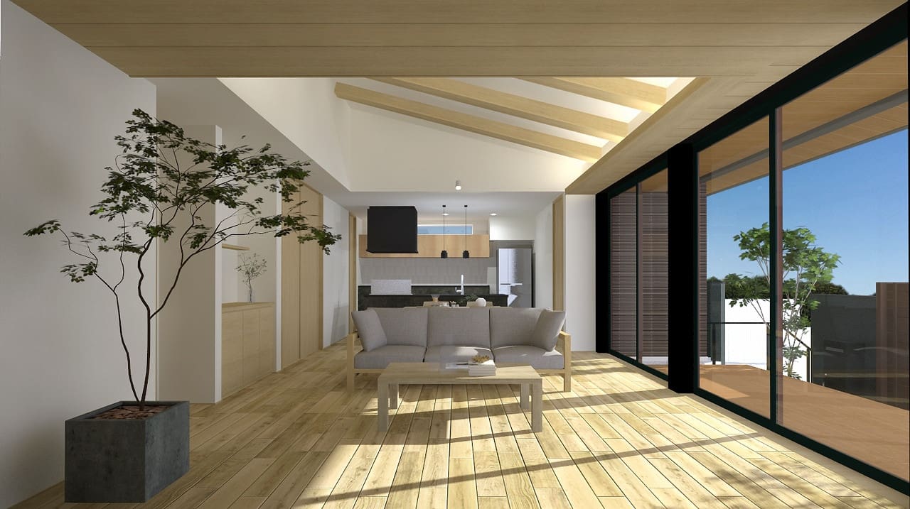 深い軒下がつくる落ち着いた陰影と、勾配天井が描くのびやかな広がり。