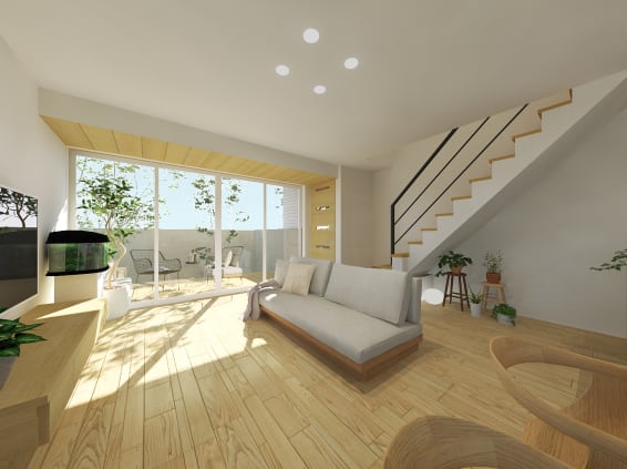 4mの大開口窓とテラスがつながる開放的な空間には、やわらかな光が差し込み、