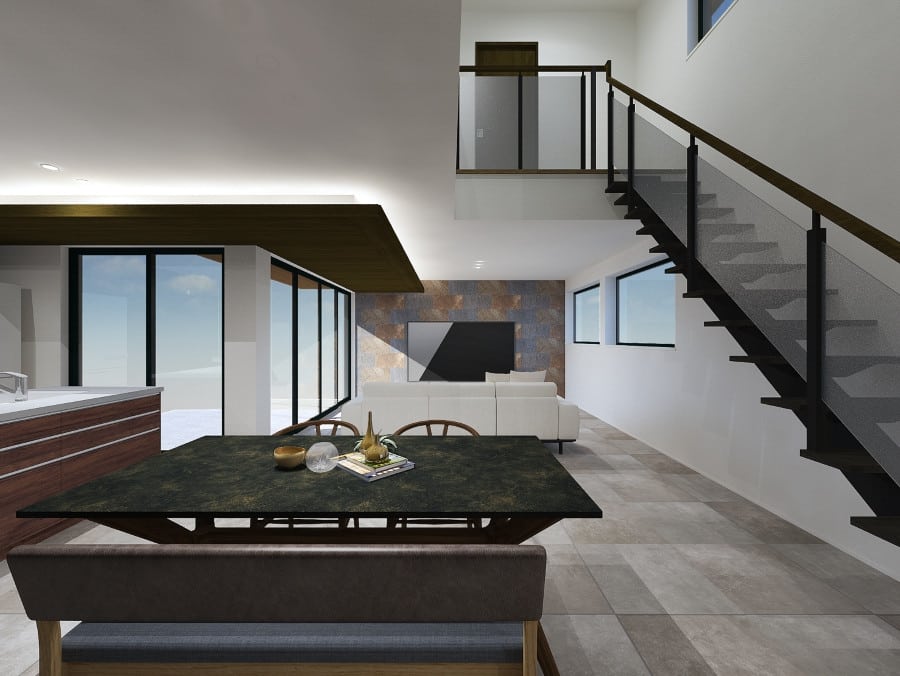 ・吹抜けシースルー階段のある約30帖の広々リビング