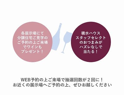 ・その場で分譲住宅予約&ご見学特典「ワインプレゼント」も1家族につき1つとさせていただきます。