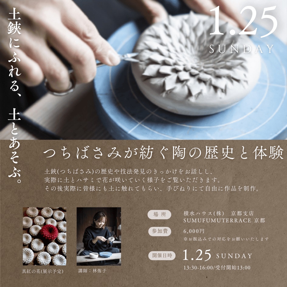 作り手の視点から、土鋏の歴史や技法発見のきっかけをお話しし、実際に土とハサミで花が咲いていく様子をご覧にいただきます。