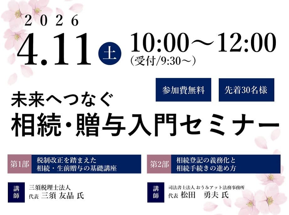 相続・贈与の基礎から2026年税制改正のポイント、相続登記義務化まで専門家に分かりやすく解説いただきます。