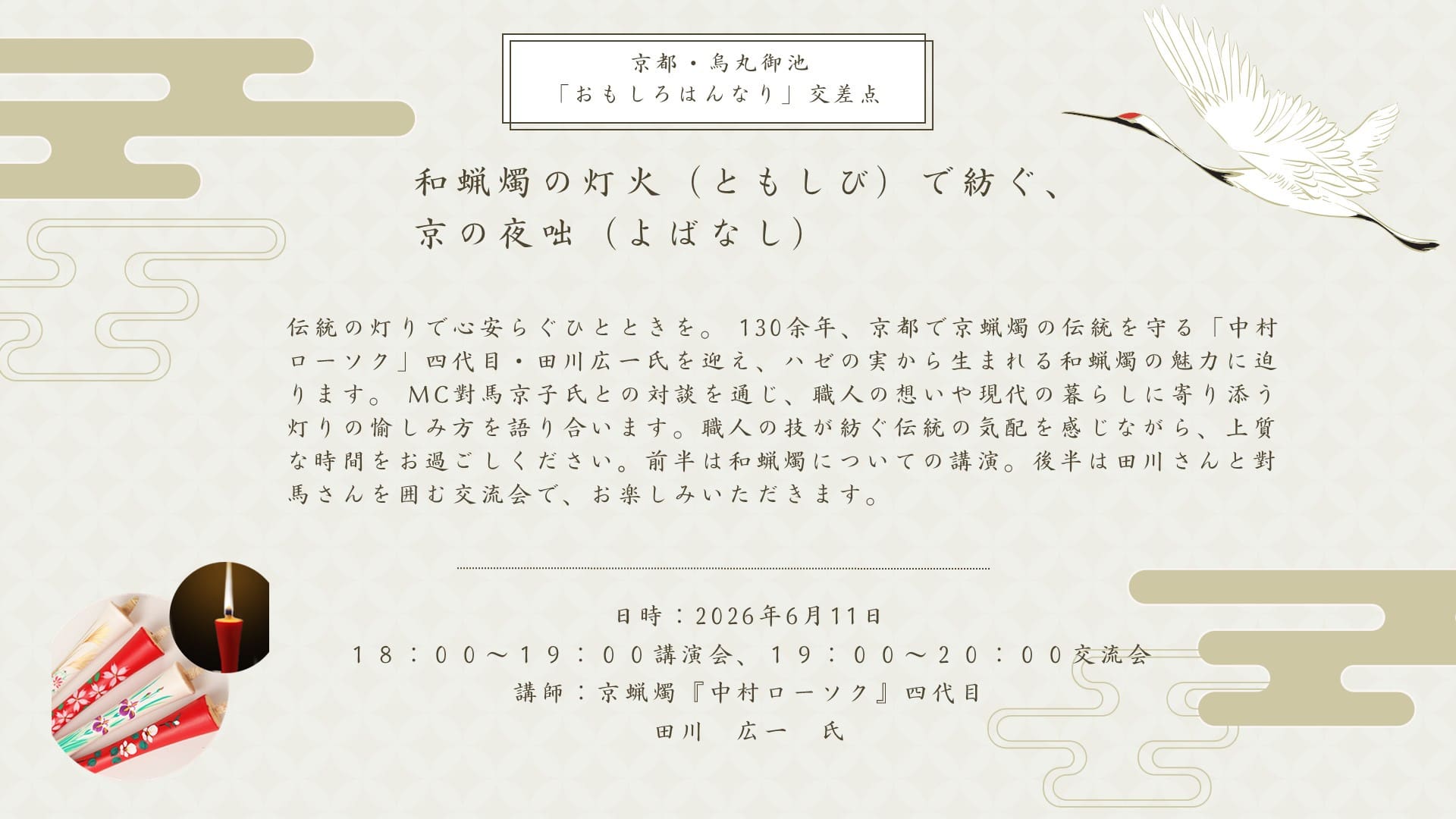 伝統の灯りで心安らぐひとときを。?130余年、京都で京蝋燭の伝統を守る「中村ローソク」四代目・田川広一氏を迎え、ハゼの実から生まれる和蝋燭の魅力に迫ります。?MC對馬京子氏との対談を通じ、職人の想いや現代の暮らしに寄り添う灯りの愉しみ方を語り合います。職人の技が紡ぐ伝統の気配を感じながら、上質な時間をお過ごしください。前半は和蝋燭についての講演。後半は田川さんと對馬さんを囲む交流会で、お楽しみいただきます。