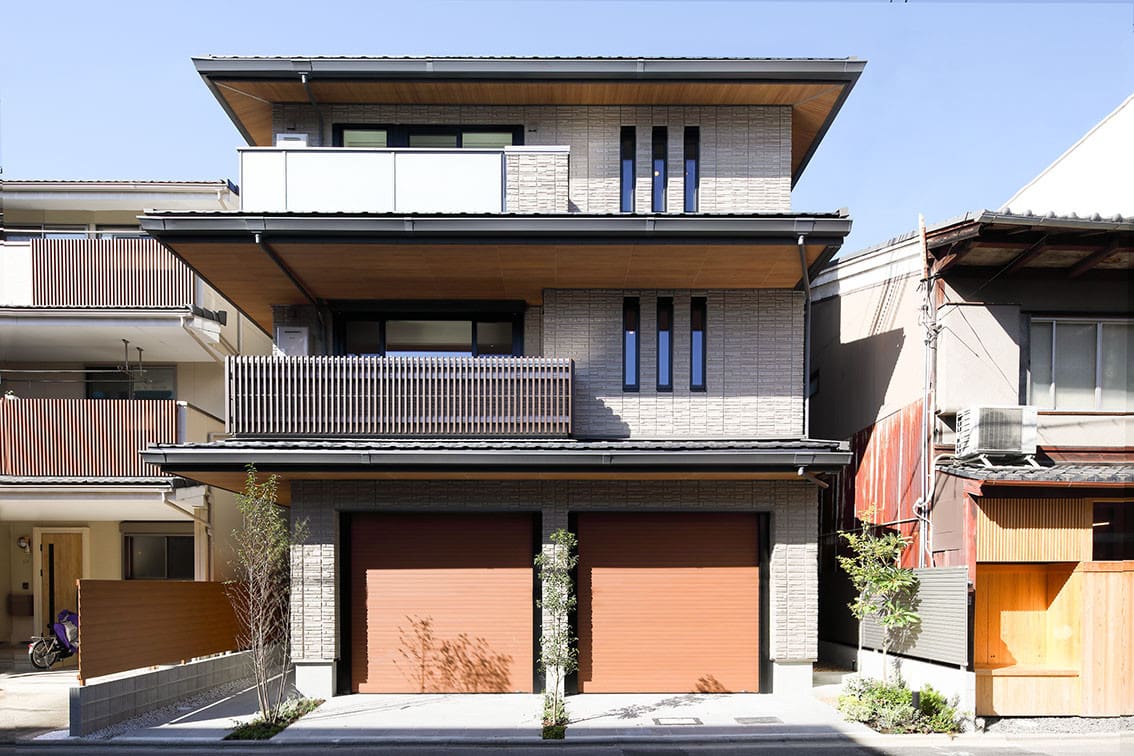 ●外観については落ち着いた色味の外壁を採用し、街と調和するように計画しております。さらに1階ビルトインガレージの木目調シャッターや2階の木調ルーバーのバルコニーで上質感を備えたファサードを演出しております。