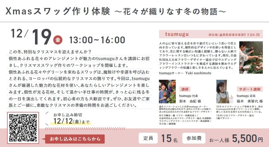 個性あふれる花々のアレンジメントが魅力のtsumuguさんを講師にお招きし、クリスマススワッグ作りのワークショップを開催します。