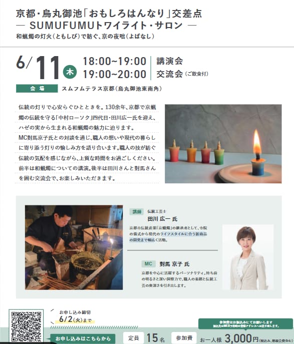 京都・烏丸御池「おもしろはんなり」交差点 SUMUFUMUトワイライト・サロン 和蝋燭の灯火で紡ぐ、京の夜咄