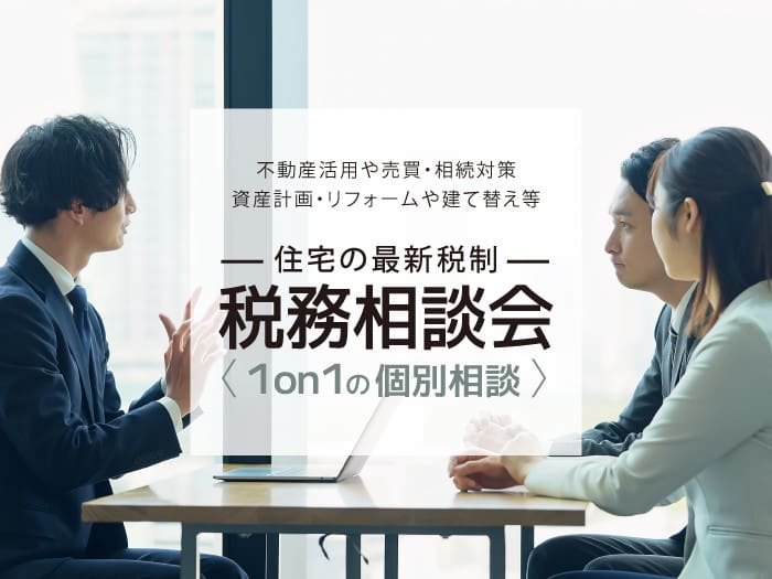 今回は、弊社と提携の税理士による「個別相談会」を開催いたします。不動産の活用・売買、相続対策、資産計画(リフォームや二世帯住宅への建て替え等)、最新税情報(住宅の税制について)についてお悩みやご質問を税理士に直接ご相談できます。是非、この機会にご参加くださいませ。