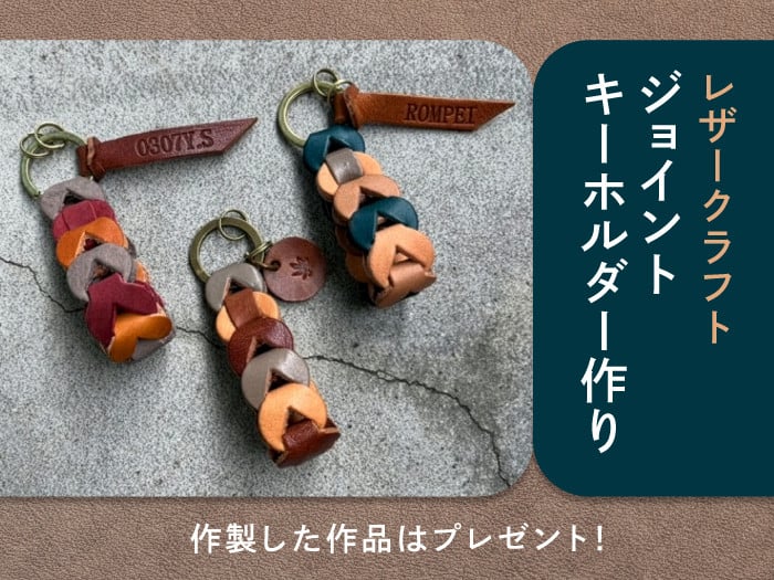 本革を使った、あなただけのオリジナル「ジョイントキーホルダー」を手作りしませんか。カラーの組み合わせや刻印で自分らしいアレンジが楽しめます。初めての方でも気軽にチャレンジできる人気のクラフト体験です。ぜひこの機会にご参加ください。