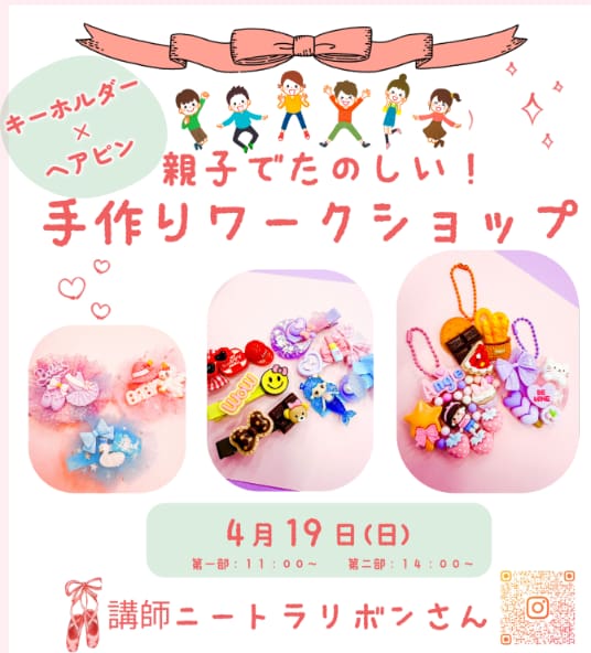 講師にニートラリボンさんをお迎えし、親子で手作りのキーホルダーやヘアピンをつくるワークショップです。