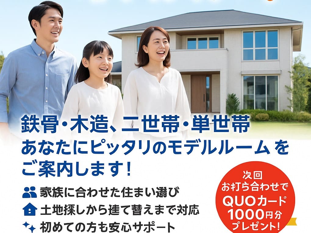 展示場へご来場いただき、次回のお打合せでクオカード1000円分プレゼントいたします。予めご了承ください。