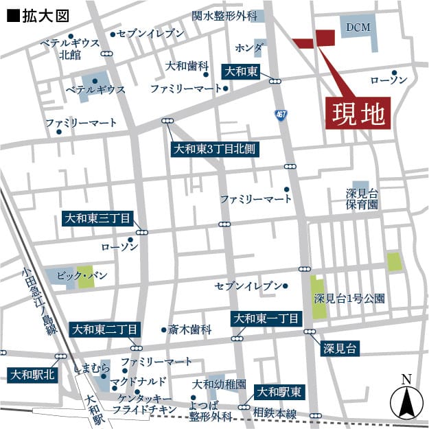 小田急江ノ島線・相鉄本線「大和」駅まで徒歩13分(約980~1,030m)の分譲地です。