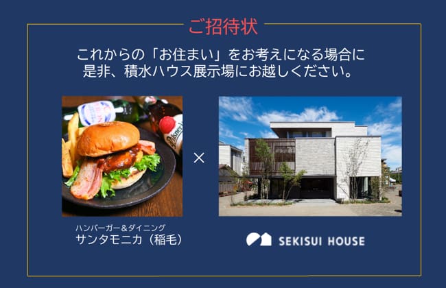 【初めての方限定】ハンバーガー&ダイニングバー「サンタモニカ」様からご紹介のお客様限定!お近くの積水ハウス展示場ご来場で3,000円分のお食事券プレゼント!