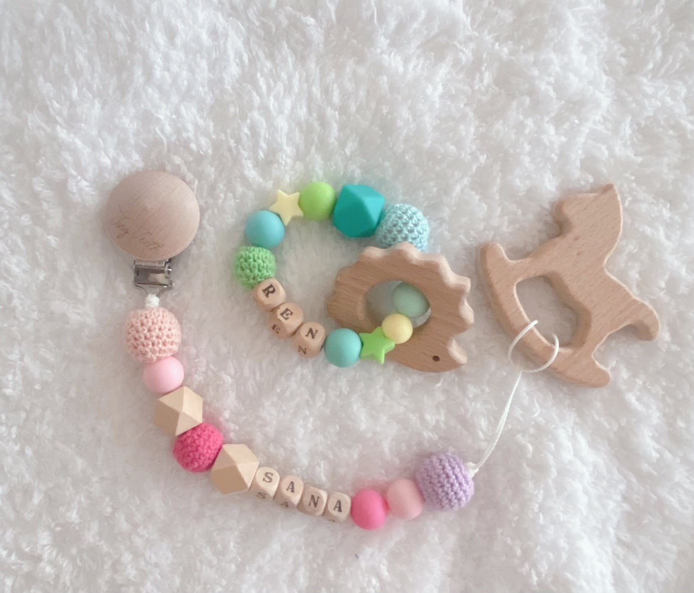 シリコンパーツや木製パーツ、モチーフ、イニシャルパーツを組み合わせてオリジナルの歯固めを作りませんか?お名前入りも可能なので世界に一つだけの可愛い作品を作りましょう。