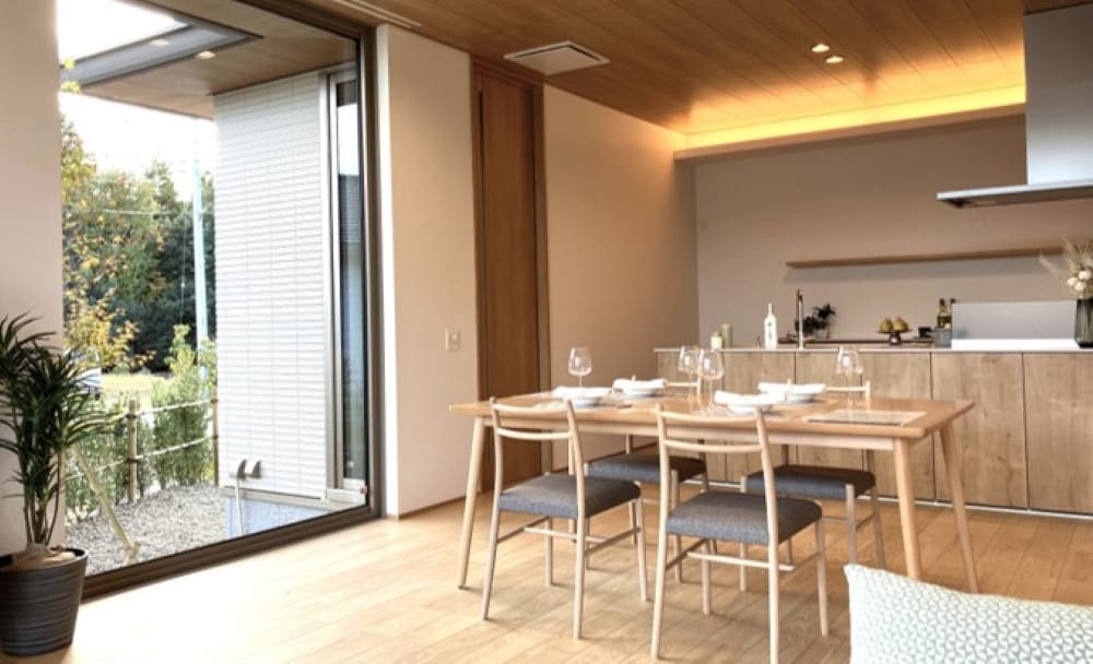天井高2700㎜や木調天井、間接照明、大開口サッシ等、モデルハウスのような邸宅です。