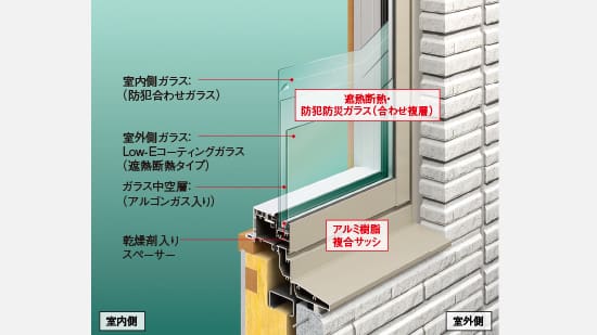 住まいの中でいちばん熱が逃げやすい窓は断熱性能を強化。室外側にアルミ、室内側には熱の出入りを極力抑える樹脂を組み合わせた、アルミ樹脂の複合構造サッシ「AJサッシ」。さらに室内側ガラス内部にコーティングされた特殊金属膜が、夏の強い太陽の熱線・紫外線をカットし、空気層(アルゴンガス入り)によって室内の熱の流出を防ぎます。