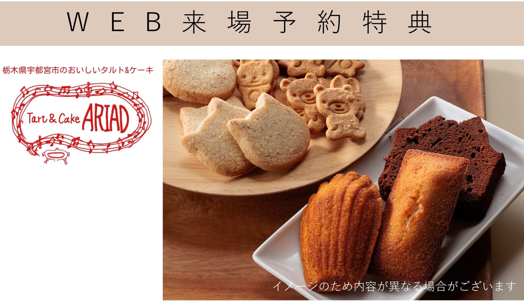 WEBよりお申込みの上、ご来場いただいた方に宇都宮市泉が丘2丁目の洋菓子店「タルト&ケーキ アリアド」の商品をプレゼントいたします。