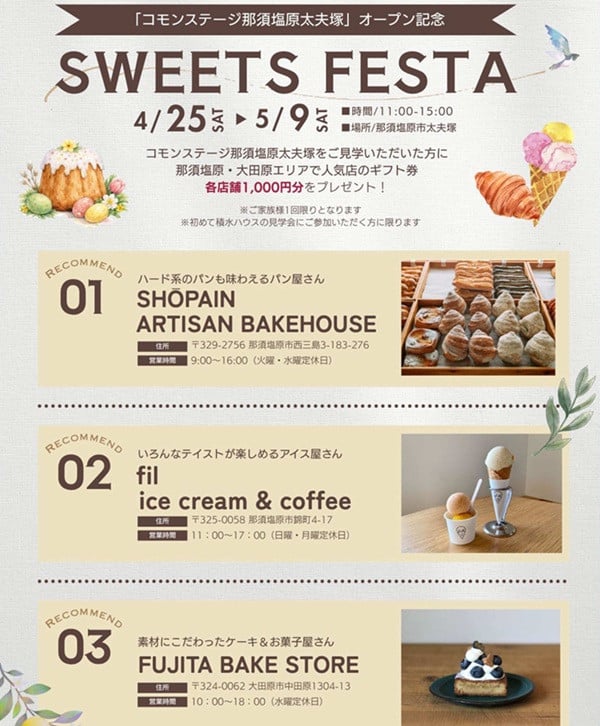 4/25~5/9の期間中、WEB予約の上ご来場いただいた方に、那須塩原・大田原エリアで人気の<ベーカリー・アイス・パティスリー>の