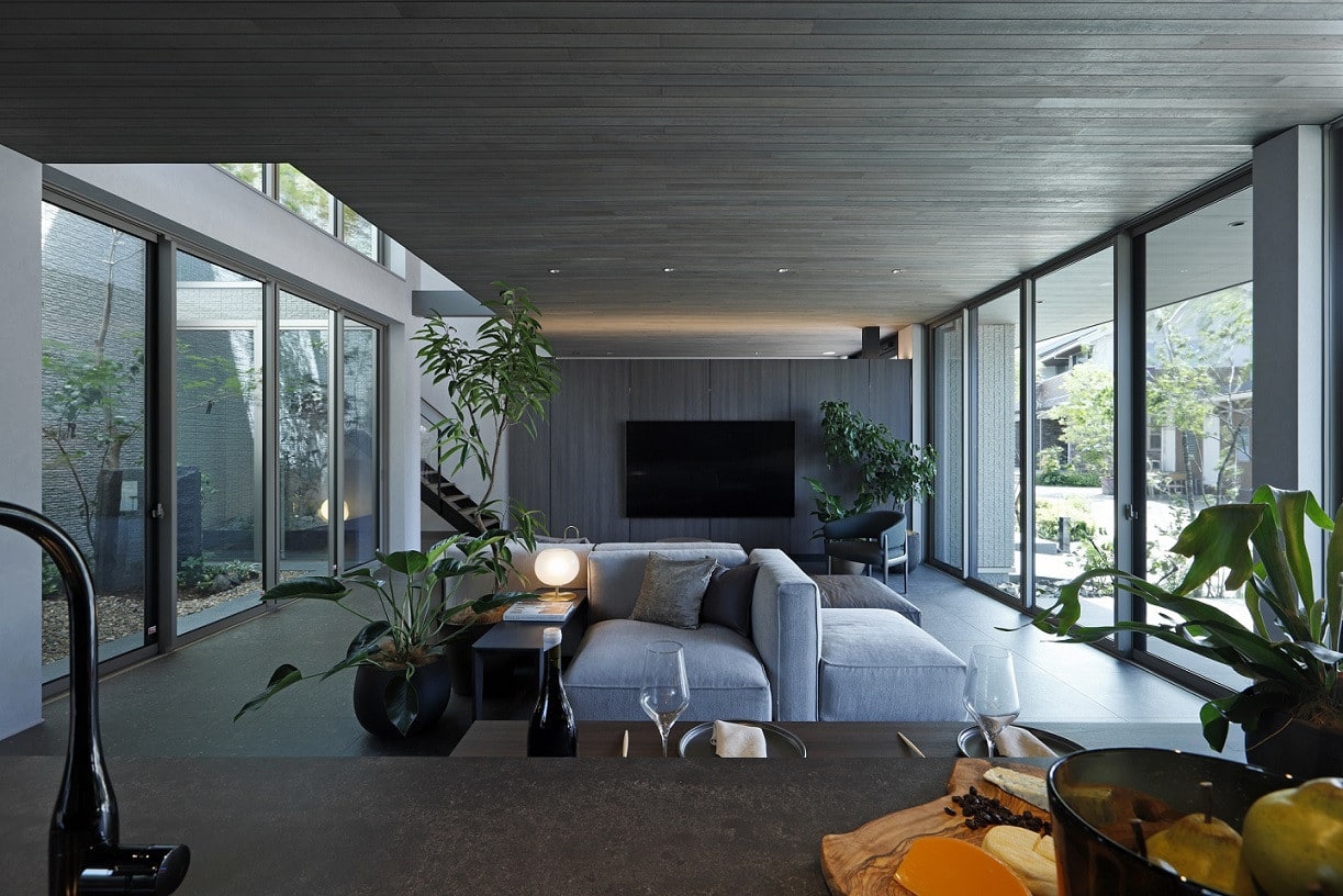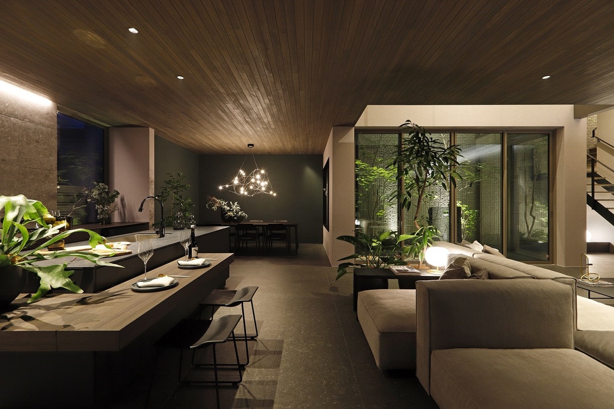 吹き抜けや中庭、テラスと繋がるLDKは縦方向へも横方向へも抜けを演出し、大空間LDKをご体感いただけます。