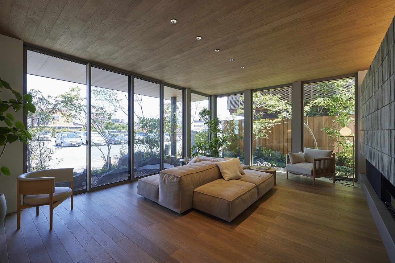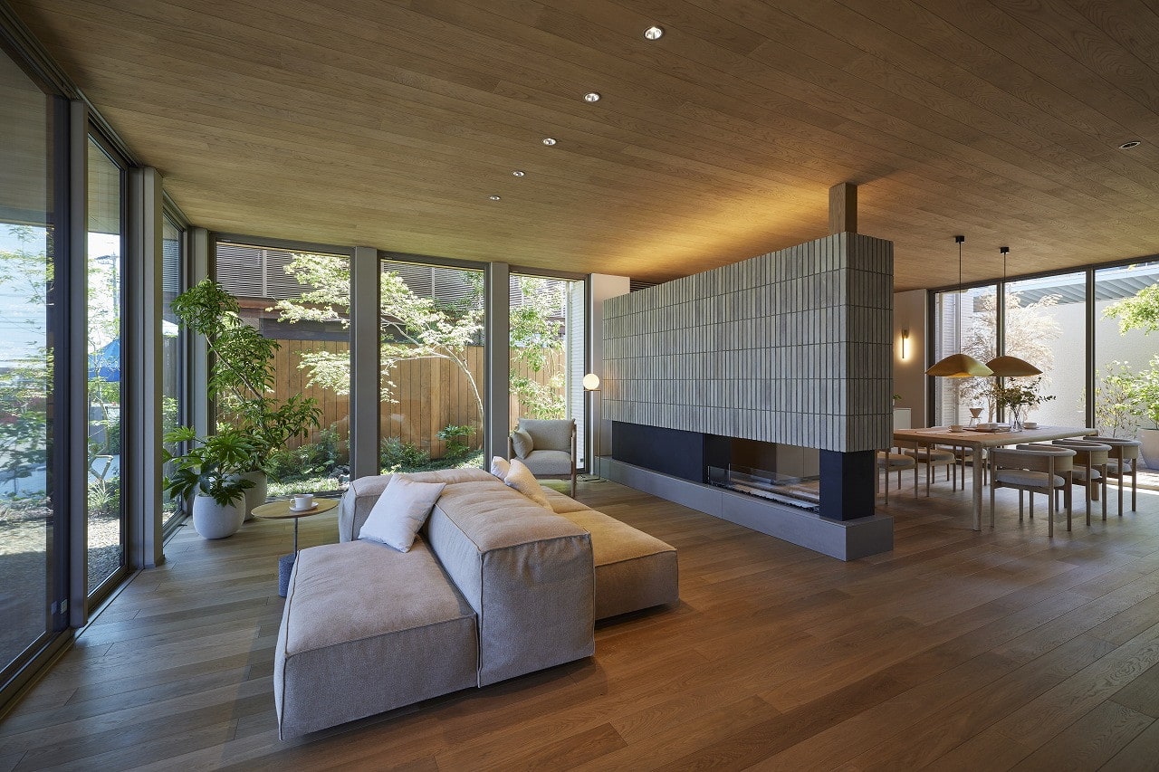 天井から軒、床からテラスへと視線が部屋の外まで届く心地のよい空間を実現した、