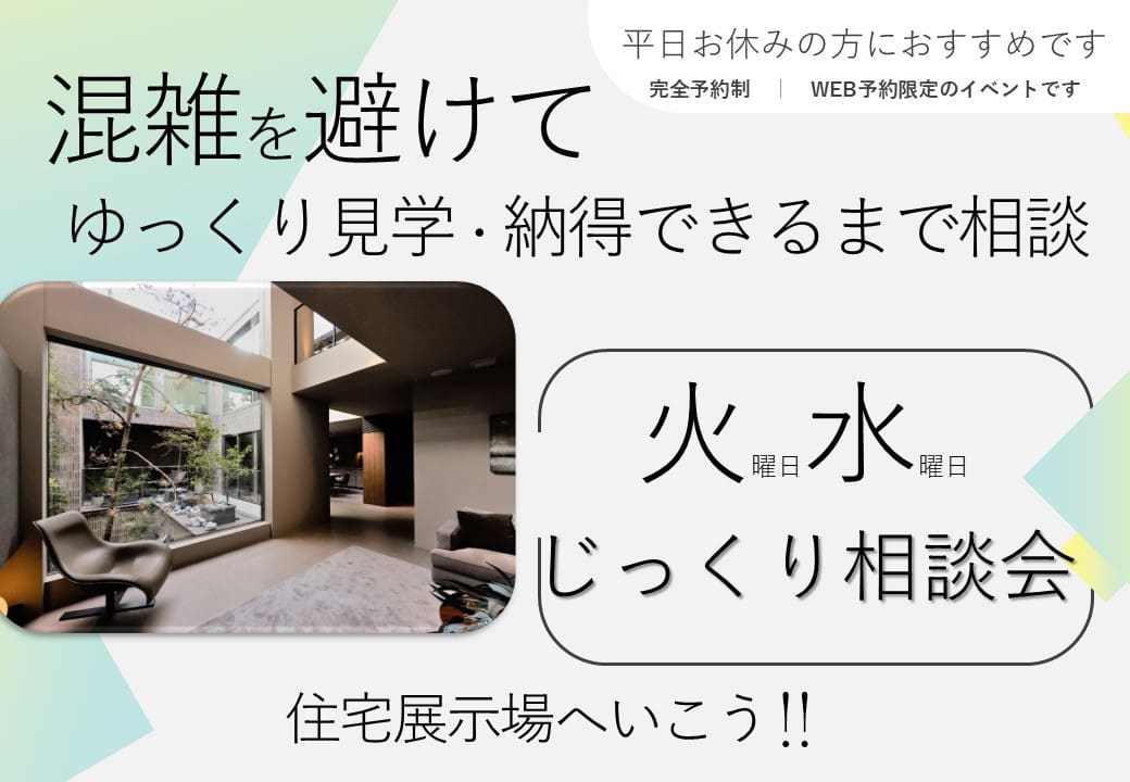 この期間、ご予約いただきましたら火曜日・水曜日に展示場をご案内します。