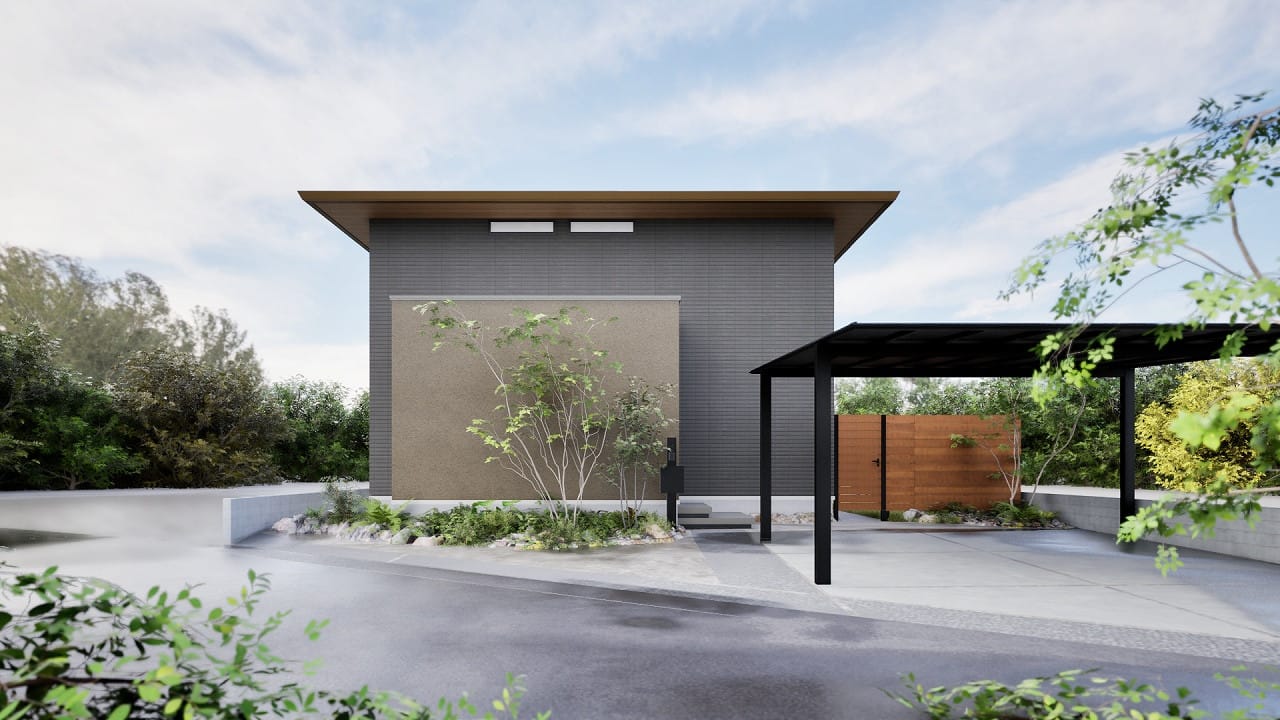 ・ベルバーンと吹付が調和するモダンな外観