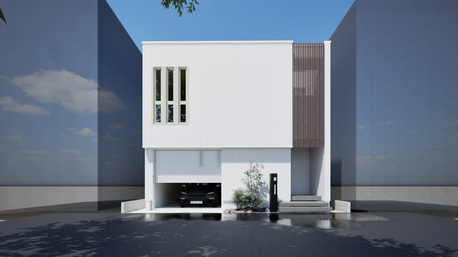 フラットなボックスと縦格子・スリット窓を構成要素としたアーバンデザインファサード。